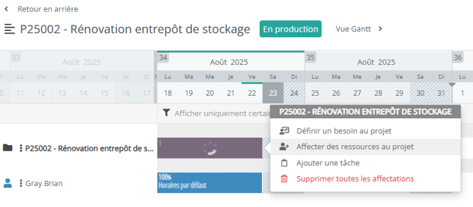 Une fois l'affectation des ressources faite, il est possible de remplacer la ressource, déplacer la ressource vers un autre projet, modifier l'affectation de la ressource au projet ou supprimer celle-ci.