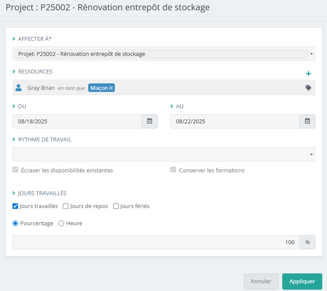 - Pourcentage / heure : Permet de définir l'affectation en pourcentage ou en heure pendant la période sélectionnée.