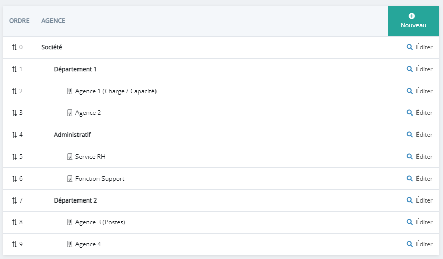 Dans notre exemple, "Monter" l'agence mère "Département 1" lui permet d'apparaître avant l'agence mère "Administratif" :