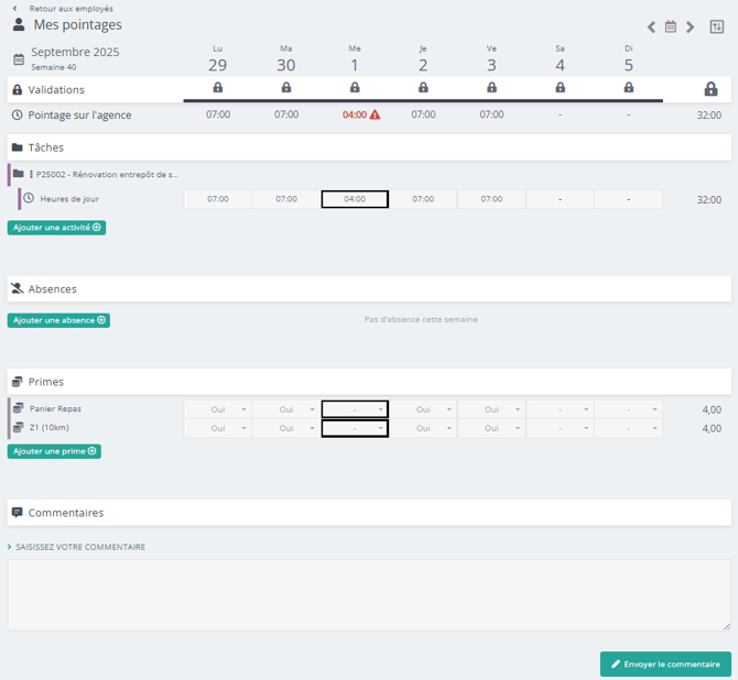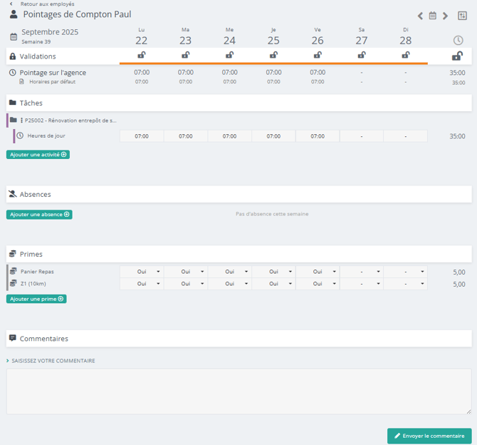 L'employé / intérimaire peut vérifier (corriger si nécessaire) les pointages préremplis en fonction de la planification des projets et du personnel y compris les absences / formations.