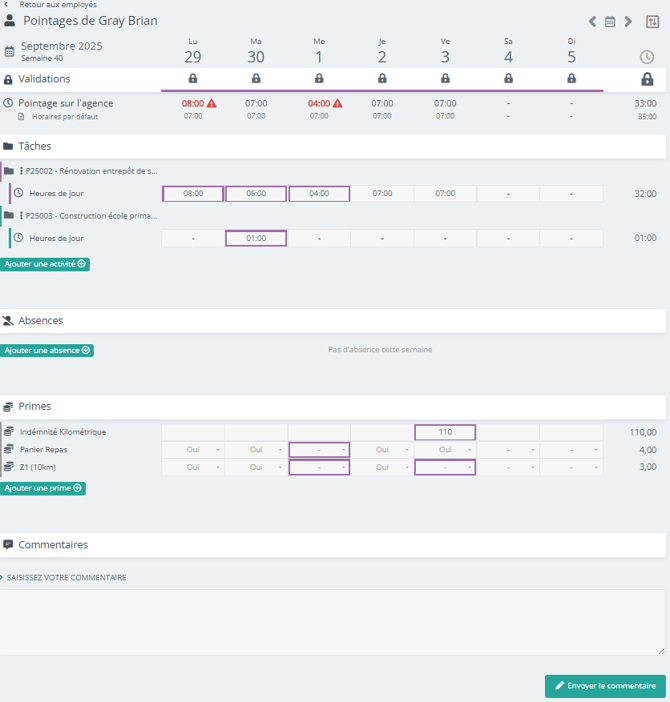 Le niveau manager peut vérifier (corriger si nécessaire) les pointages préremplis en fonction de la planification des projets et du personnel y compris les absences / formations.