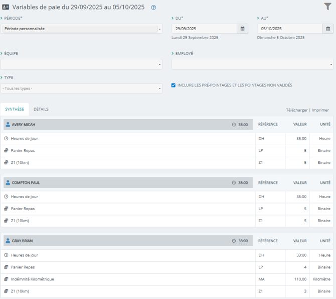 Une fois les pointages effectués / validés, vous pouvez extraire les données pour votre logiciel de paie via le rapport variables de paie.