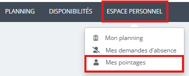 Pour réaliser / vérifier vos pointages en tant qu'employé / intérimaire, vous devez vous rendre dans le menu "Espace Personnel > Mes pointages" :