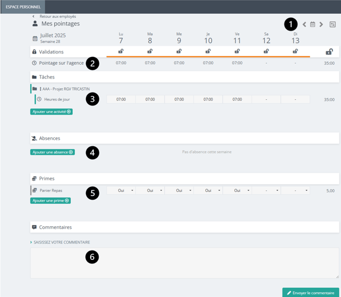 1 - Vous accédez directement à vos pointages de la semaine en cours. Vous pouvez modifier la période en utilisant ![]()