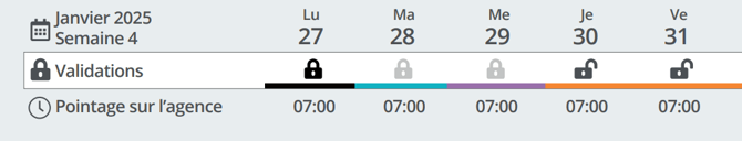 Nota : Tant que votre manager ou votre RH n'ont pas validés vos pointages, vous pouvez déverrouiller celui-ci pour le modifier si nécessaire. Si votre manager ou votre RH ont verrouillés votre pointage, vous ne pouvez plus le modifier (voir la couleur des cadenas).