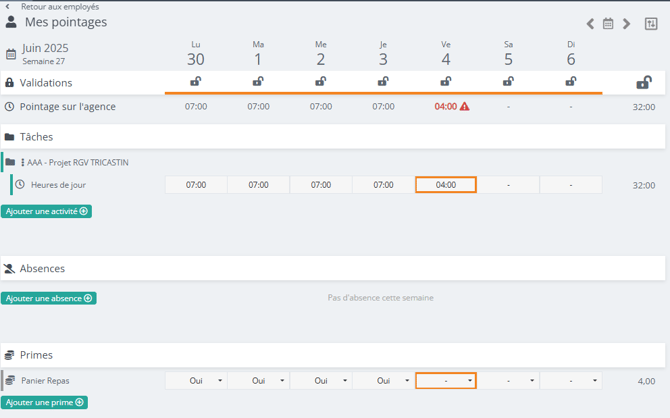 1- J’ai travaillé que 4h le Vendredi matin donc je dois enlever mon panier repas. Cliquez dans le cadre de la prime à modifier et changer la valeur. Un liseré orange est ajouté à la case. Ceci indique qu’une modification a été effectuée.