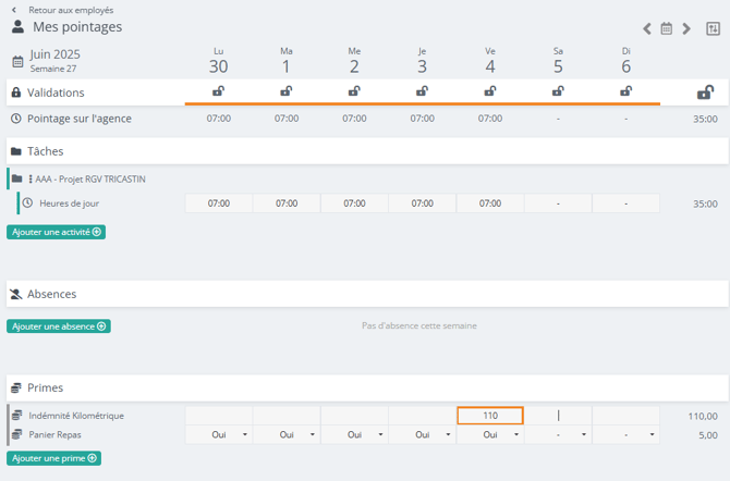 (si vous y avez accès), sélectionnez votre type de prime et saisissez la valeur correspondante (ici dans l'exemple kilomètre).