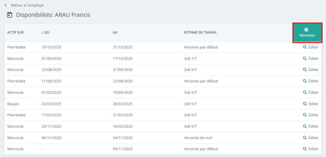 Vous pouvez alors définir une disponibilité sur une agence entre deux dates pour un rythme de travail donné en cliquant sur "Nouveau" :