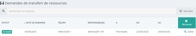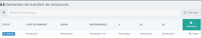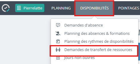 Pour effectuer une demande de prêt depuis Staff Planning, vous devez vous rendre dans Disponibilités / Demandes de transfert de ressources :