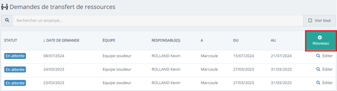 Pour faire une nouvelle demande, il faudra cliquer sur "Nouveau" :