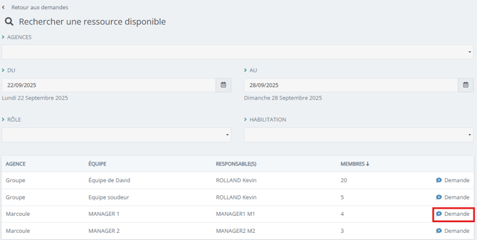 Vous devrez alors faire une recherche sur les ressources disponibles au sein des différentes agences. Une fois votre recherche effectuée, vous pouvez cliquer sur l'agence / équipe choisit objet de votre demande et cliquer sur "Demande" :