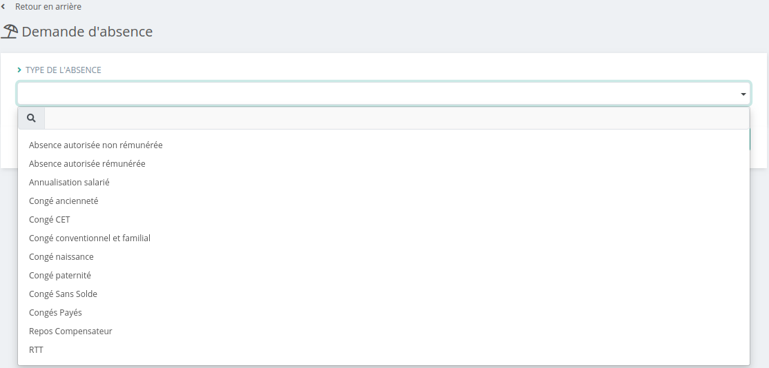 Sélectionnez ensuite le type d'absence que vous souhaitez demander :