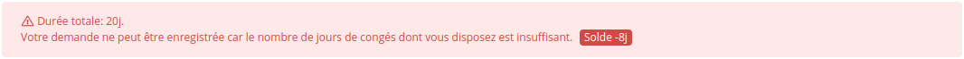 Pour les demandes d'absences qui seraient liées à un compteur d'absence, si vous effectuez une demande dont la durée est supérieure à votre solde disponible un message d'erreur vous l'indique et vous empêche de sauvegarder votre demande.
