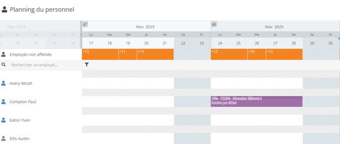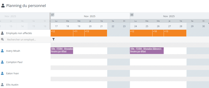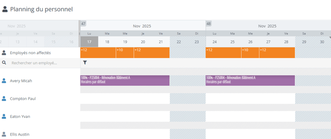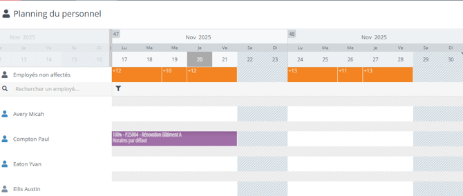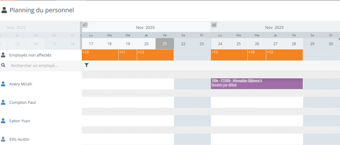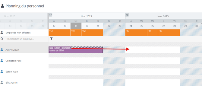 M AVERY n'est plus affecté au projet "P25004 - Rénovation Bâtiment A" du 17/11 au 21/11 mais du 17/11 jusqu'au 28/11 :