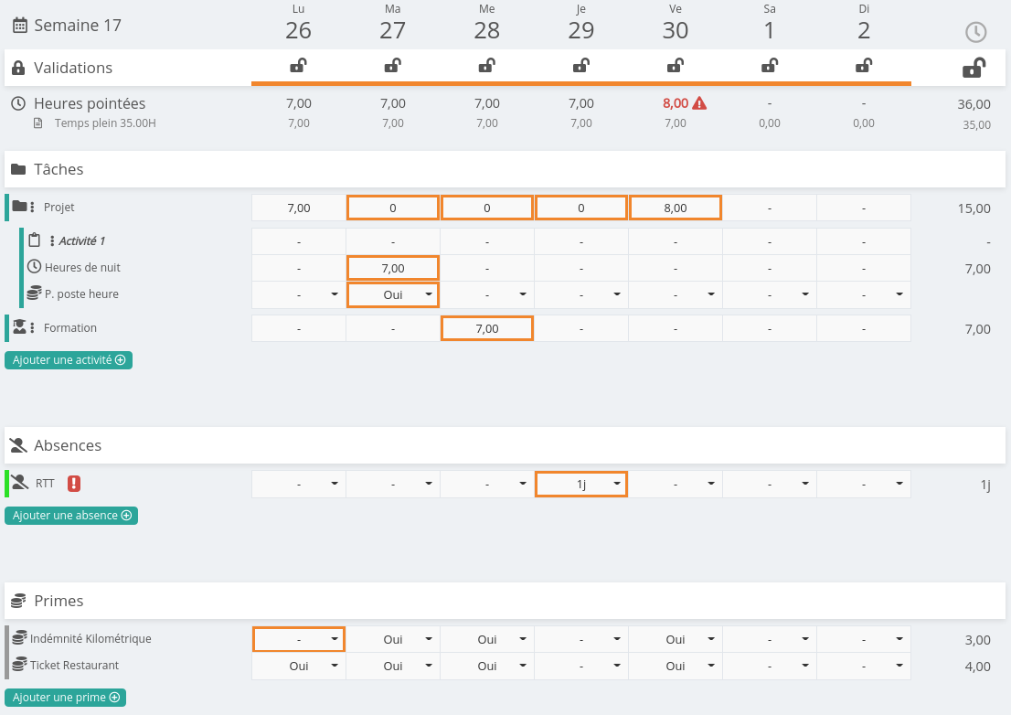 Les éléments pré-remplis automatiquement grâce à la planification et les rythmes de travail, tels que les pointages et les primes, apparaissent normalement.
