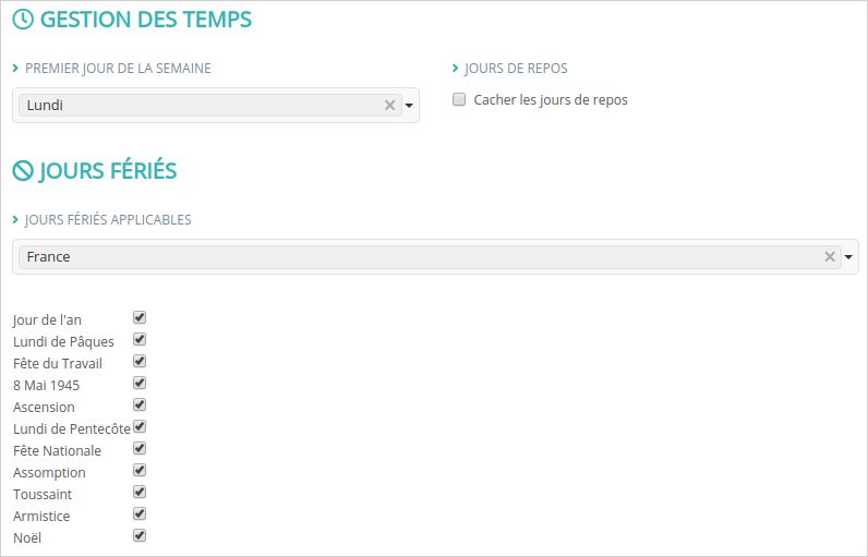 Permet de définir les jours fériés qui seront visuellement identifiés dans le planning et considérés comme des jours non travaillés dans le pointage.