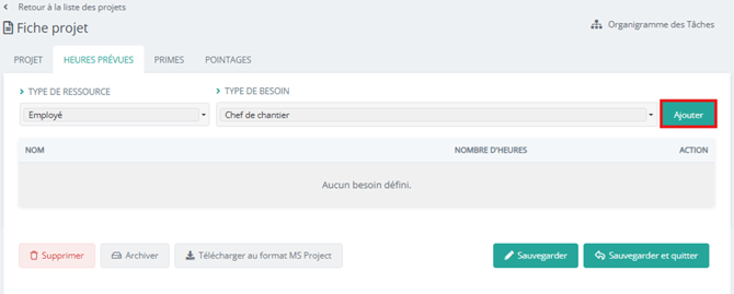 Pour ajouter une ressource, il faut sélectionner un type de ressource ainsi que le type de besoin puis cliquer sur « ajouter » :
