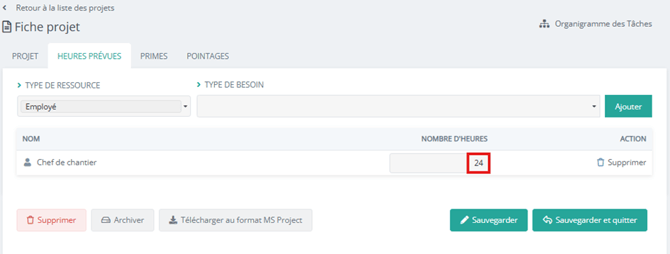 Une fois la ressource ajoutée, il ne reste plus qu’à définir le volume horaire sur le projet puis sauvegarder :