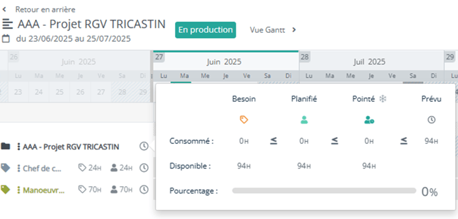 vous permet de consulter l’état d’avancement du projet ou des types de ressources en détaillant besoin / planifié / pointé / prévu avec le disponible restant et le pourcentage d’avancement.