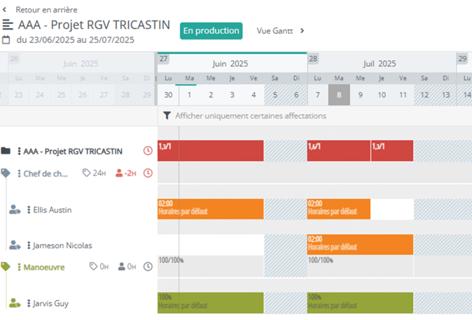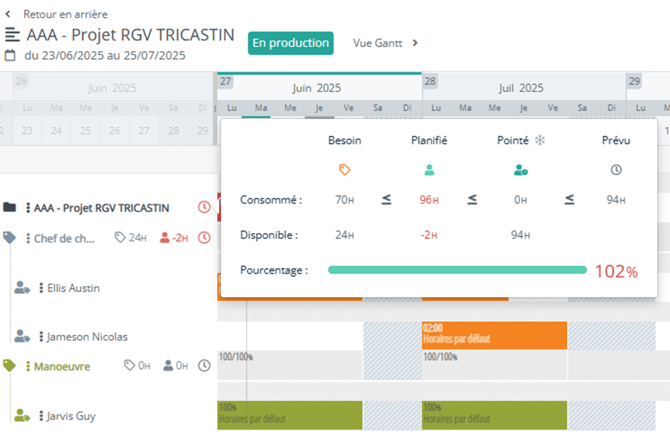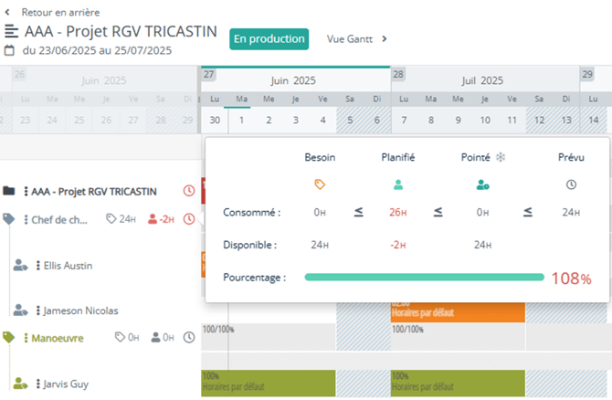 En cas de dépassement sur une ressource ou sur le projet, les icônes deviendront rouges et permettent d’éviter des dérives éventuelles :