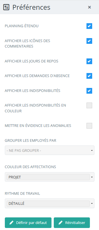 Si vous souhaitez avoir des préférences par défaut à chaque ouverture du planning du personnel, vous pouvez cocher / décocher vos préférences et cliquer sur "définir par défaut". Cette nouvelle définition des préférences s'appliquera à chaque connexion Staff Planning. Les préférences sont spécifiques à l'utilisateur et n'impactent pas les autres utilisateurs.