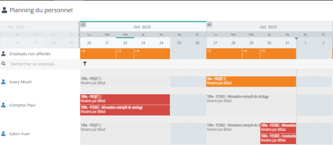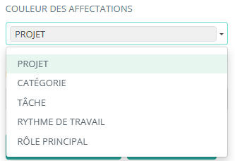 Dans votre planning du personnel, les affectations sont en couleur. Avec la préférence "couleur des affectations", il est possible de définir si la couleur qui va s'afficher va être celle du projet objet de l'affectation ou bien celle de la couleur de la catégorie de projet ou tâche ou rythme de travail ou rôle principal. En cas de sous-affectation, la couleur sera orange et en cas de sur-affectation, la couleur sera rouge.