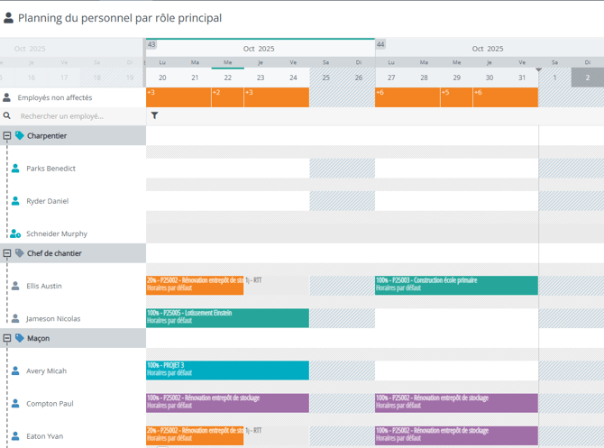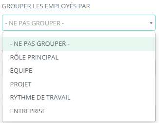 Dans votre planning du personnel, si vous ne groupez pas les employés / intérimaires, ceux-ci s'afficheront par ordre alphabétique. Vous avez la possibilité de définir des favoris (voir article "Classer vos plannings en ajoutant certains de vos projets, employés, matériels et sous-traitants aux favoris" pour le détail). Il est également possible de grouper les employés / intérimaires par rôle principal ou équipe ou projet ou rythme de travail ou entreprise (utile si planning multi-agence).