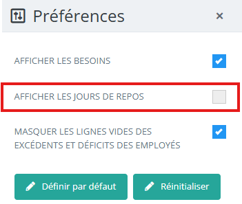 Si la préférence est décochée, vous n'aurez pas les jours de repos dans le planning :