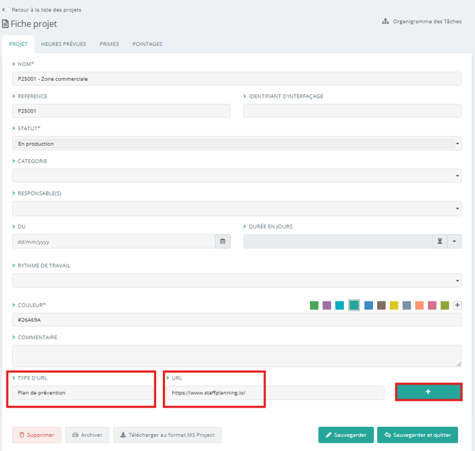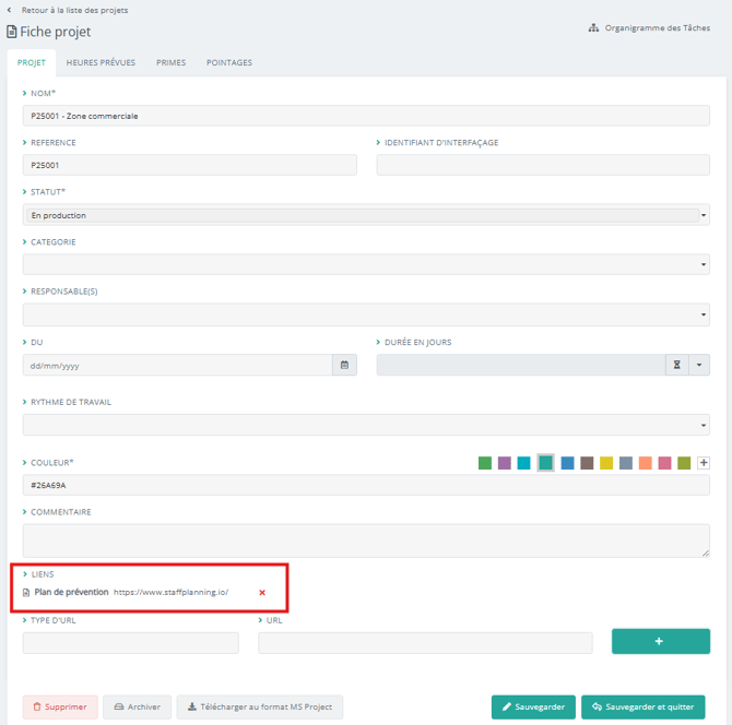 Il est possible d'associer dans les fiches projets des liens URL permettant notamment aux employés de les ouvrir depuis leur planning.
