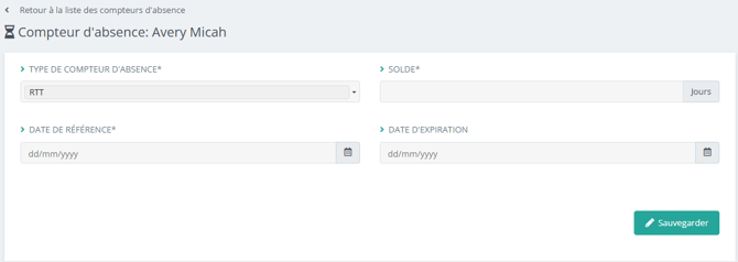 Pour chaque nouveau compteur, vous devrez sélectionner le type de compteur d'absence, le solde ainsi que la date de référence (début du solde) et sa date d'expiration :
