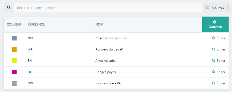 Les types d'absences vous permettent de lister toutes les absences auxquelles vos employés peuvent être affectés.