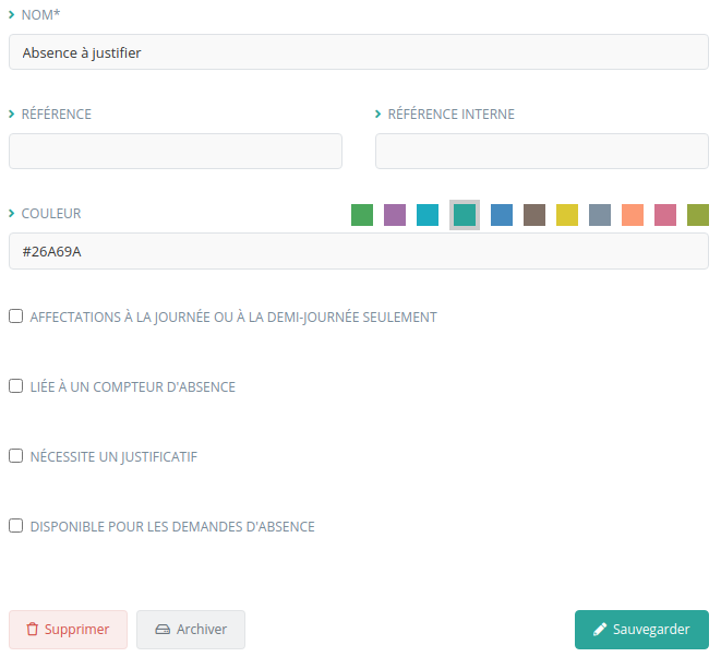 Vous pouvez utilisez des couleurs personnalisées pour vos types d'absence.