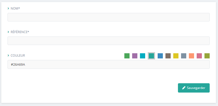 Lorsque vous créez un nouveau type de formation, vous pouvez lui définir un nom, une référence (code/rubrique de votre logiciel de Paie) et une couleur :