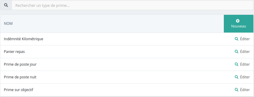 Les types de prime vous permettent de lister toutes les primes (ou éléments variables) qui peuvent être attribuées, manuellement ou automatiquement, aux salariés :